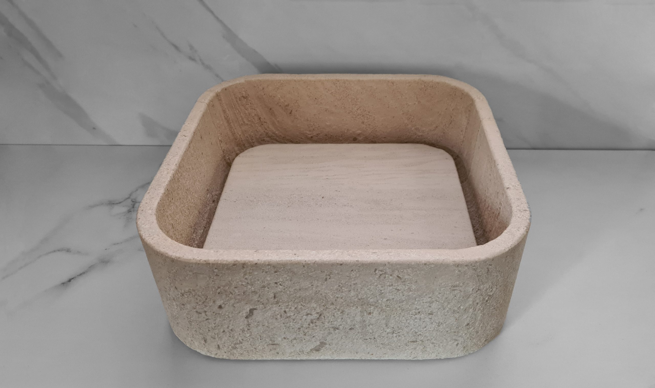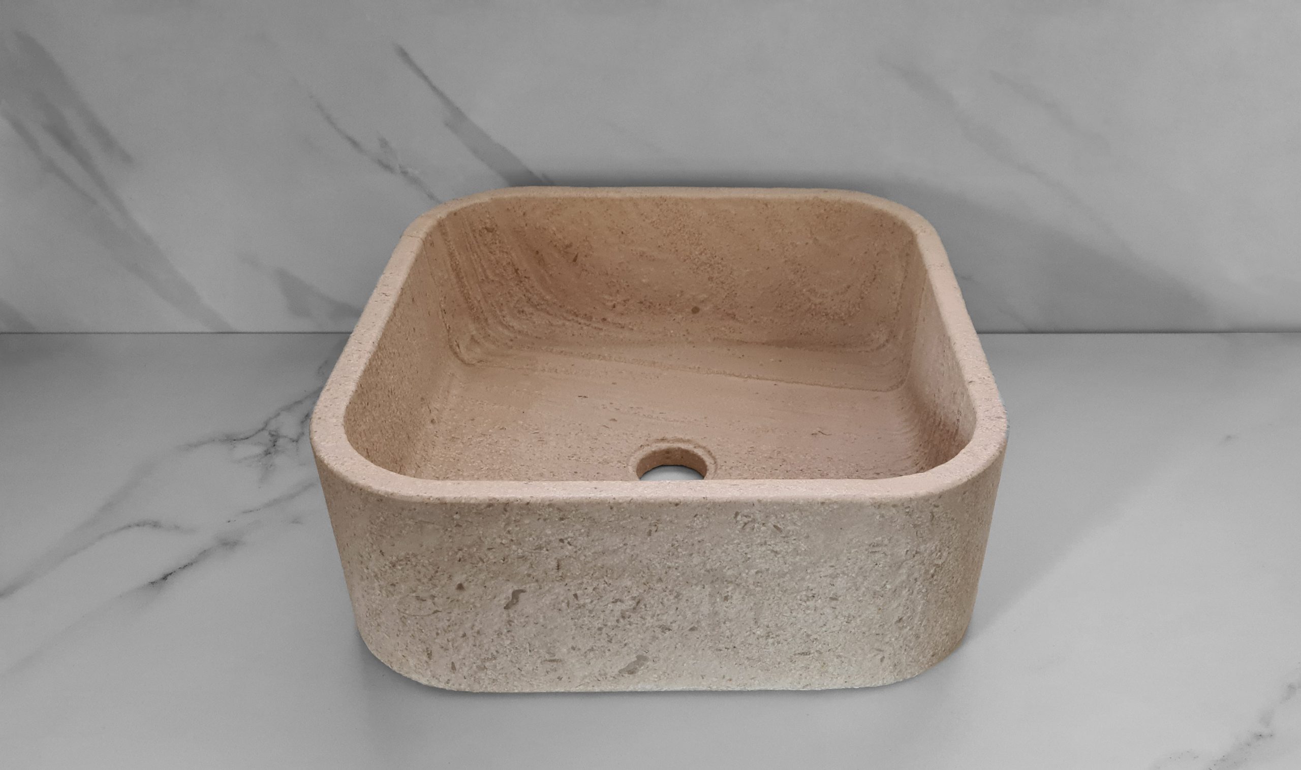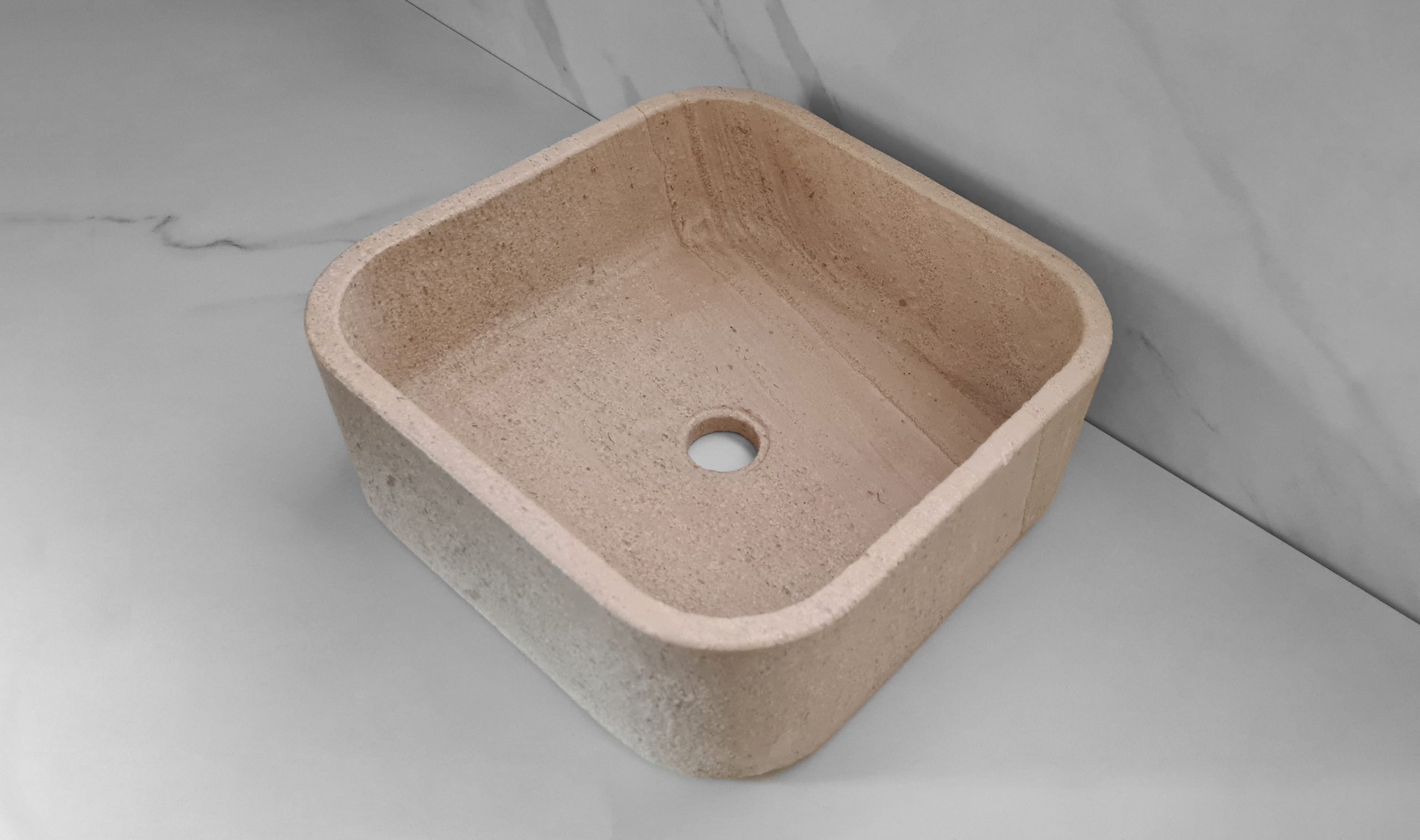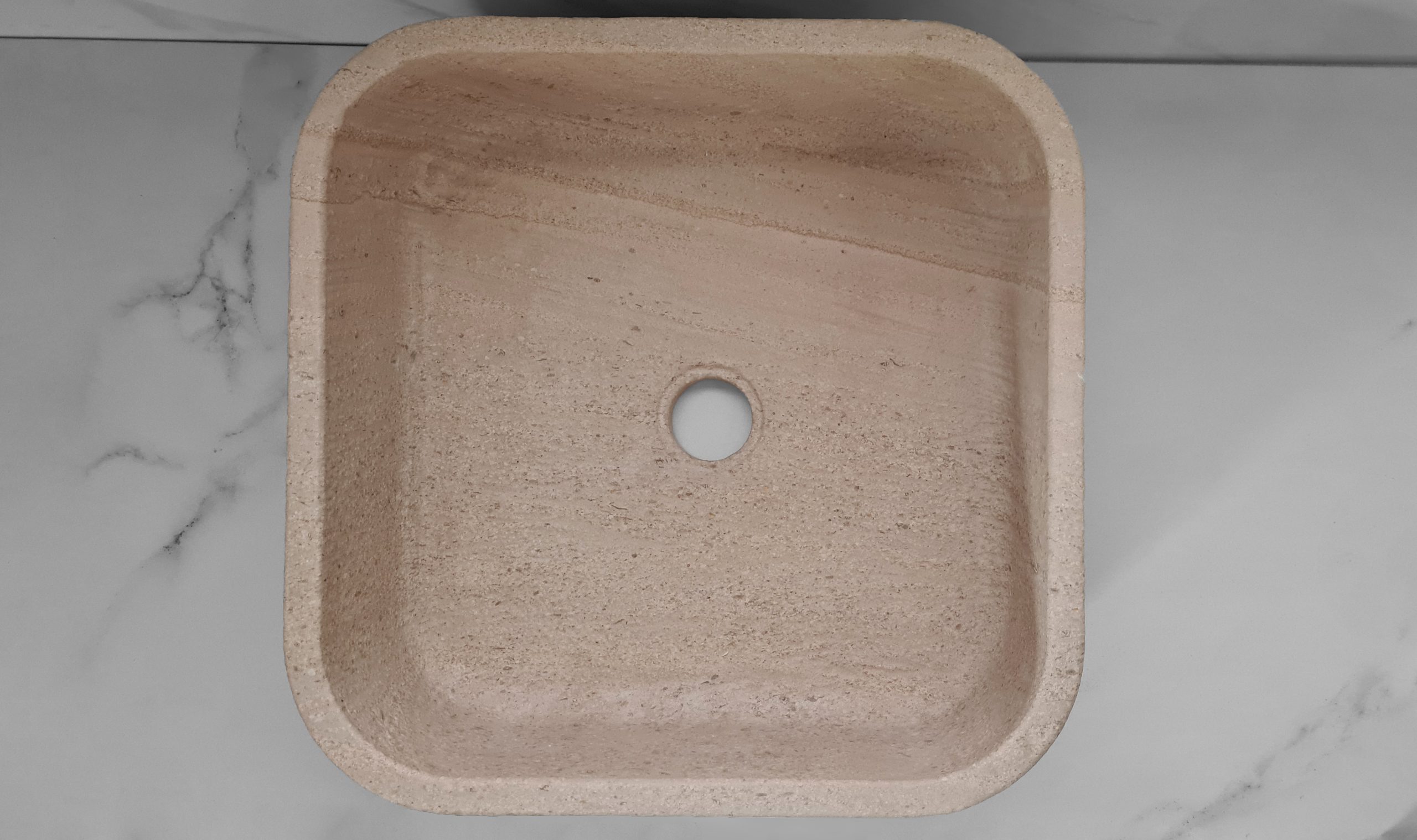 Επιτραπέζιος μασίφ νιπτήρας από μάρμαρο Crema Moca διαμορφωμένος στο χέρι.
