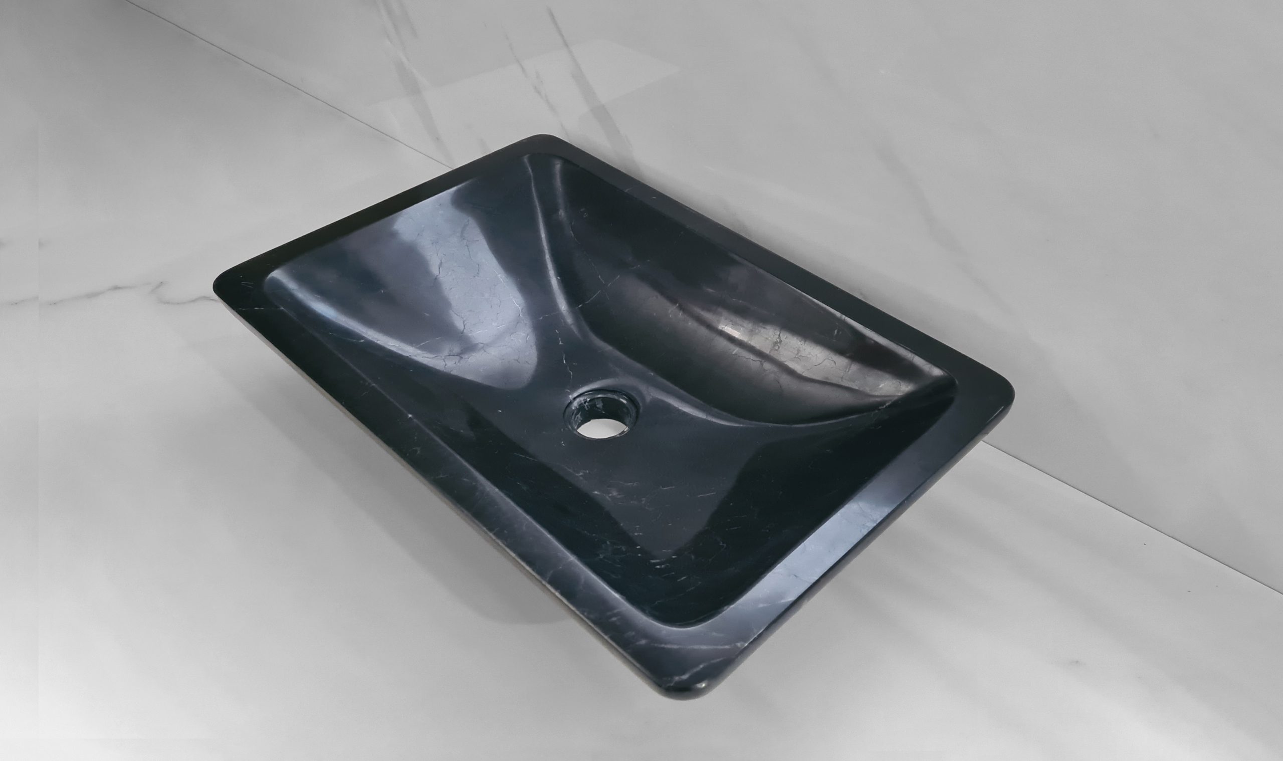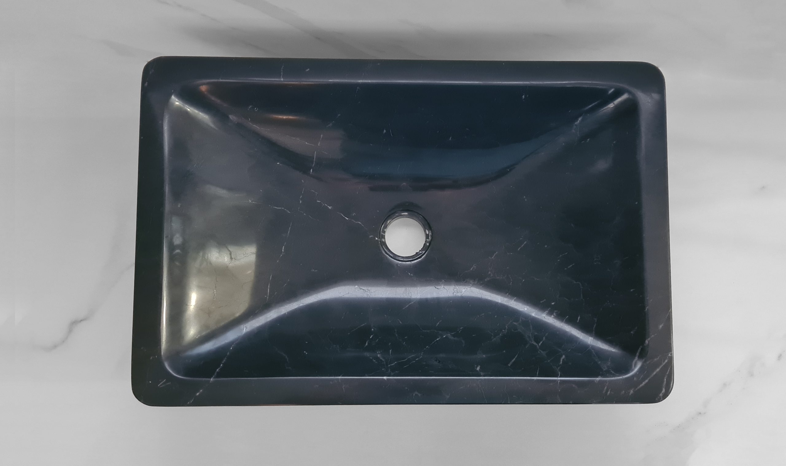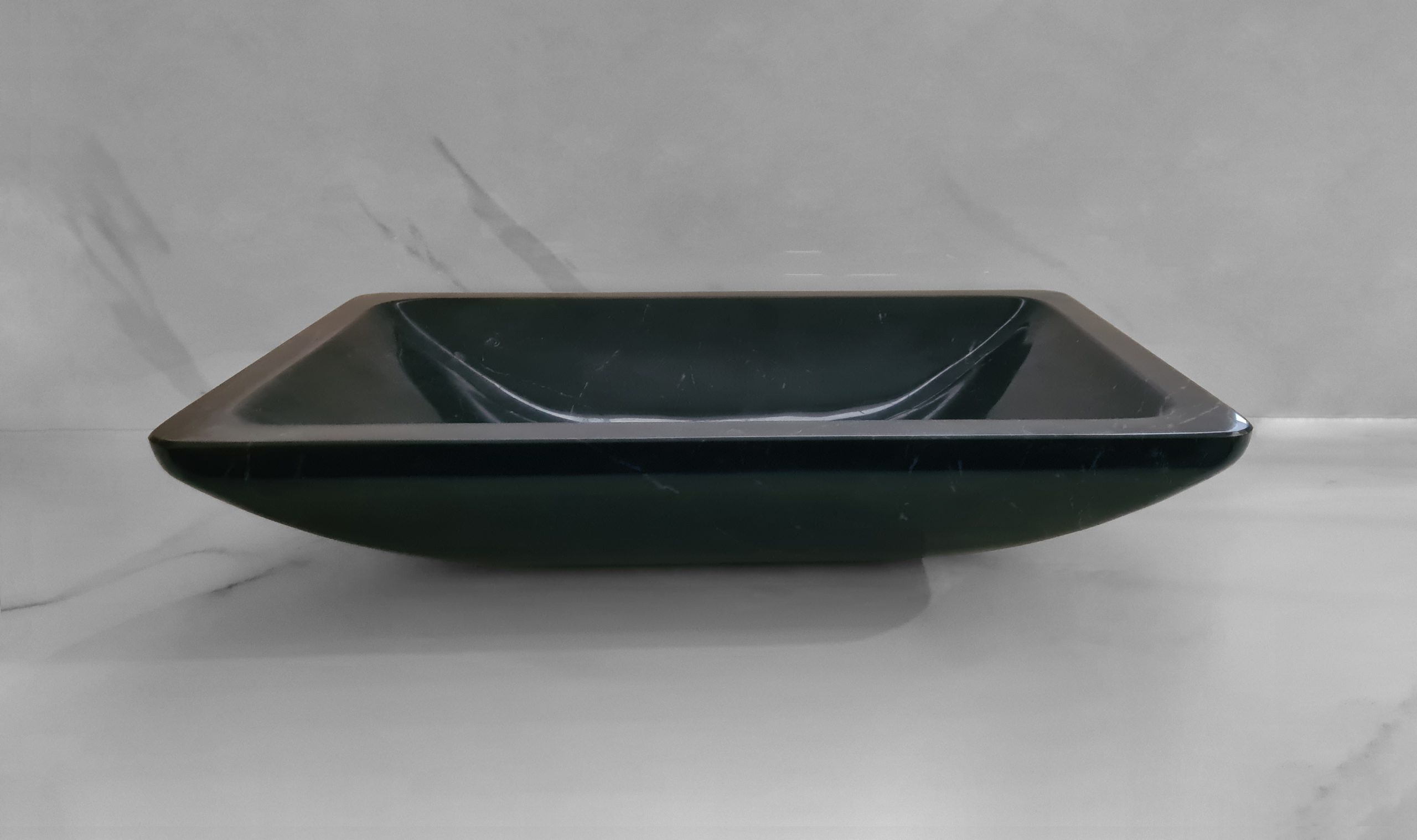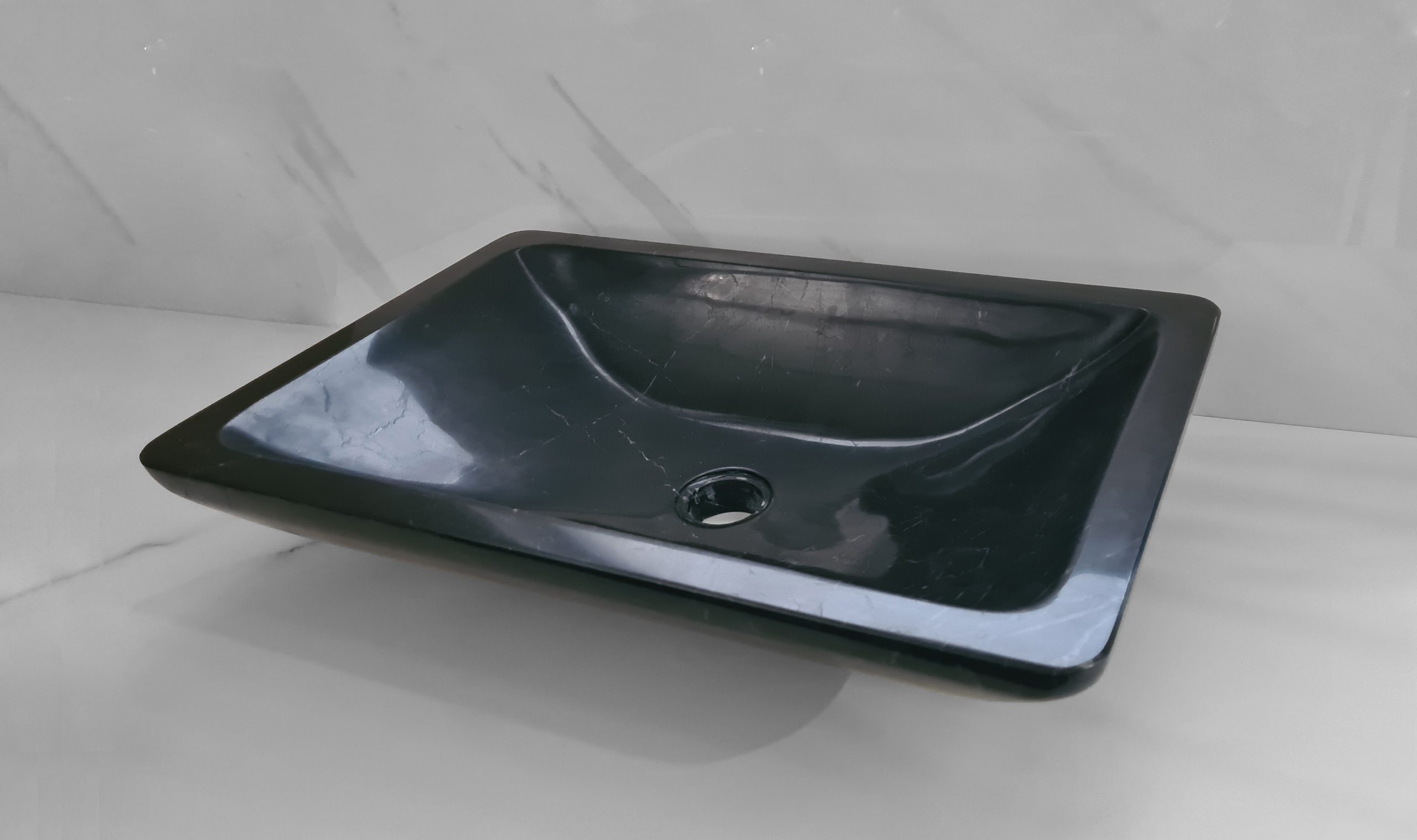Επιτραπέζιος μασίφ νιπτήρας από μάρμαρο Nero Marquina διαμορφωμένος στο χέρι.
